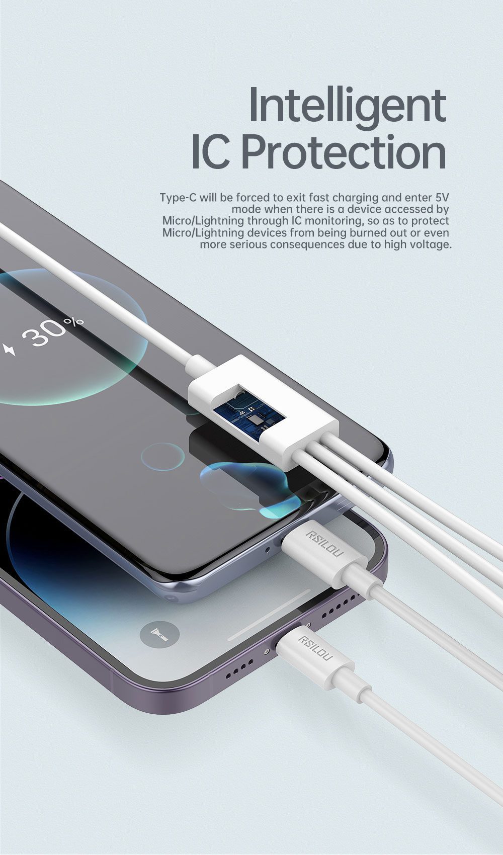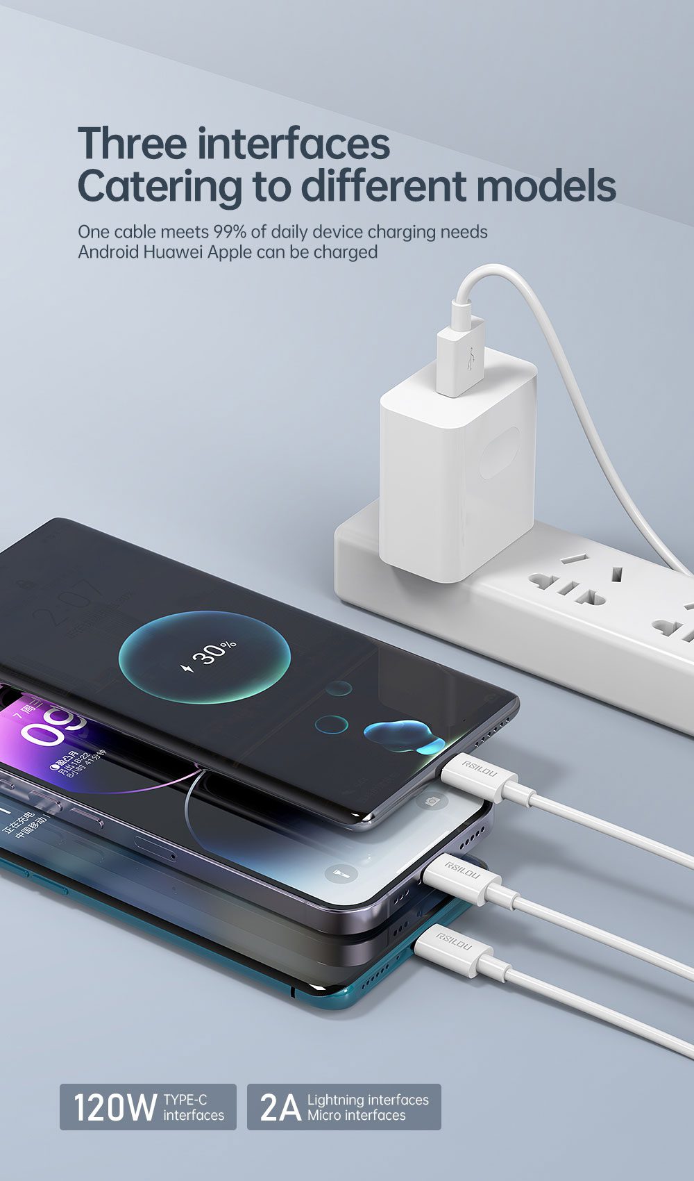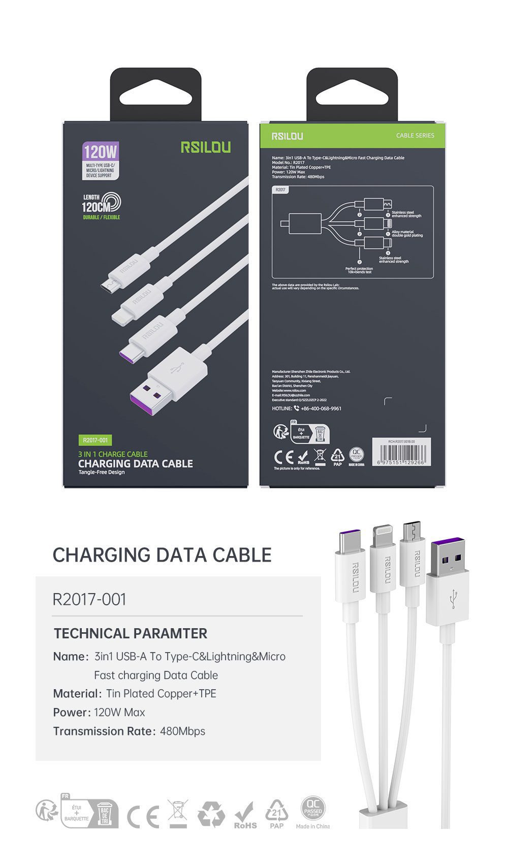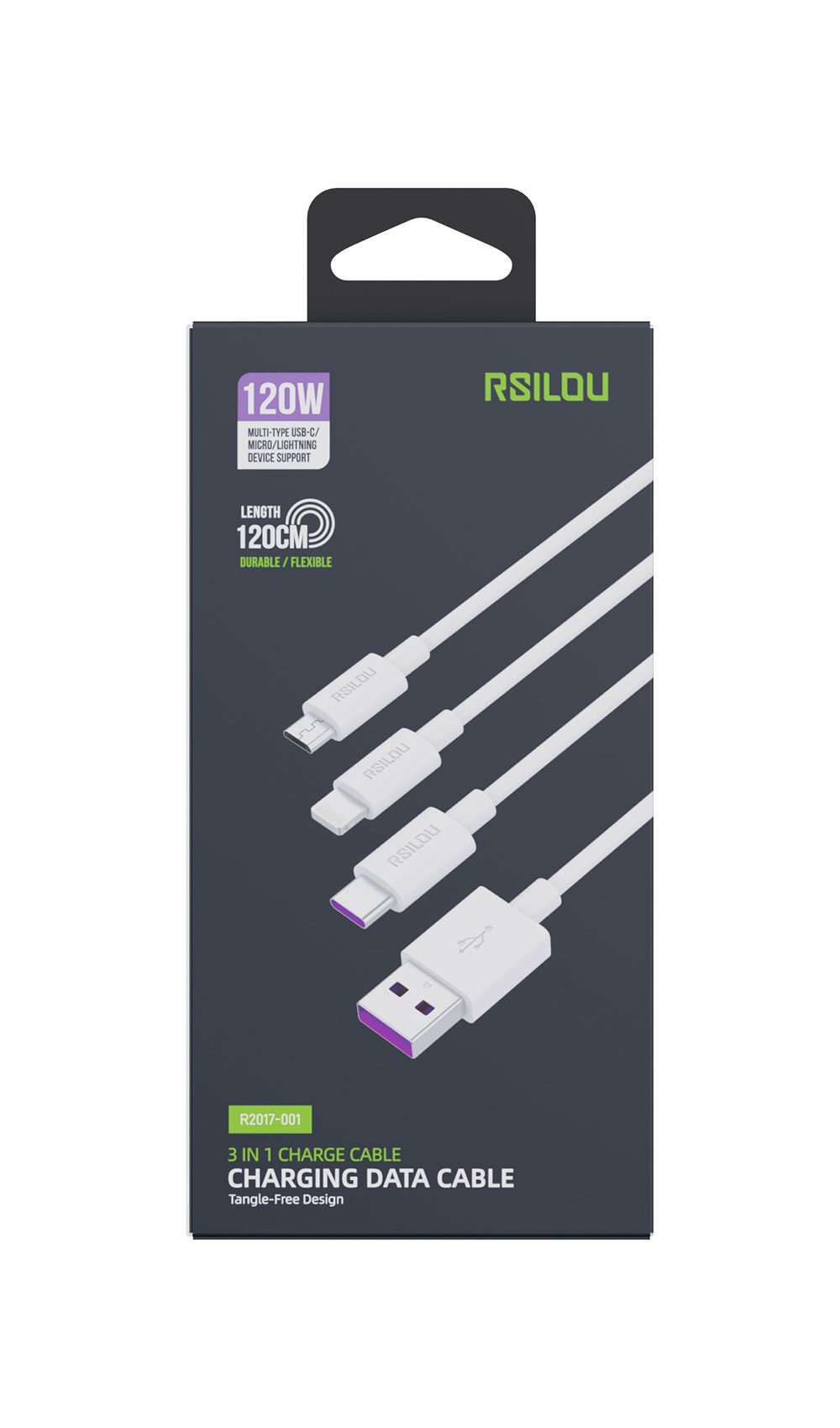 Charge all your devices with a single powerful cable. The RSILOU R2017 3-in-1 Fast Charging Cable is designed for convenience, durability, and high-speed performance. Featuring USB-A to Type-C, Lightning, and Micro USB connectors, this cable allows you to charge multiple device types without carrying separate cables. With up to 120W fast charging support, reinforced materials, and a tangle-free flexible design, it is perfect for everyday use at home, in the office, or while traveling.